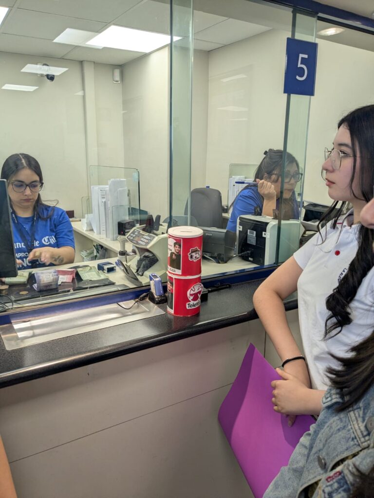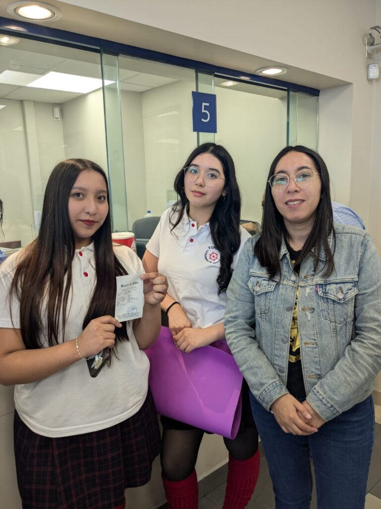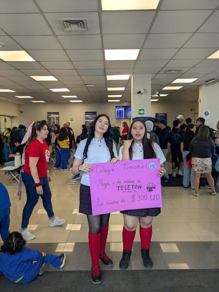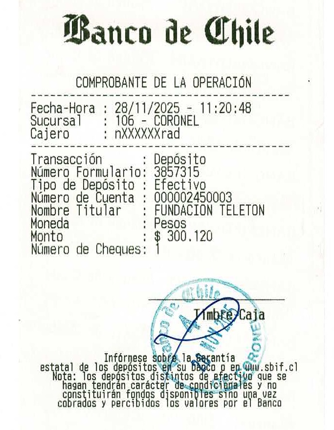 Hoy viernes 28, las compañeras del Centro de Alumnos, Martina Diaz y Josefa Durán, acompañadas de la profesora guía de esta organización Valeria Cofré, recolectaron el aporte de cada curso y procedieron a hacer el deposito en el Banco de Chile, el que en esta oportunidad fue de $ 300.120. Se agradece esta campaña, la que va en beneficio de todos los niños de la Teletón.